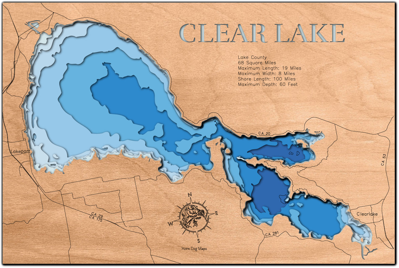 Clear Lake, CA 3D Nautical Wood Map, Barnwood Frame, 14″ x 18″